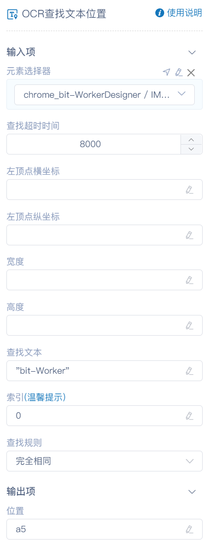 执行逻辑:RPA通过识别选取元素,将识别出的内容与查找文本文本中的内容按照查找规则进行一致性判断,如果一致,则读取元素所在坐标,并返回到位置*变量*值中
