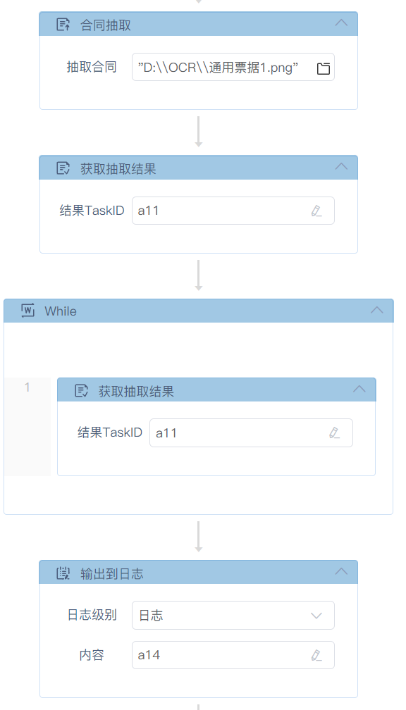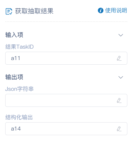 执行逻辑:本活动为联合使用,先获取到【合同抽取】活动返回的结果TaskID,再对对应的id内容进行抽取,并将内容输出到结构化输出变量中