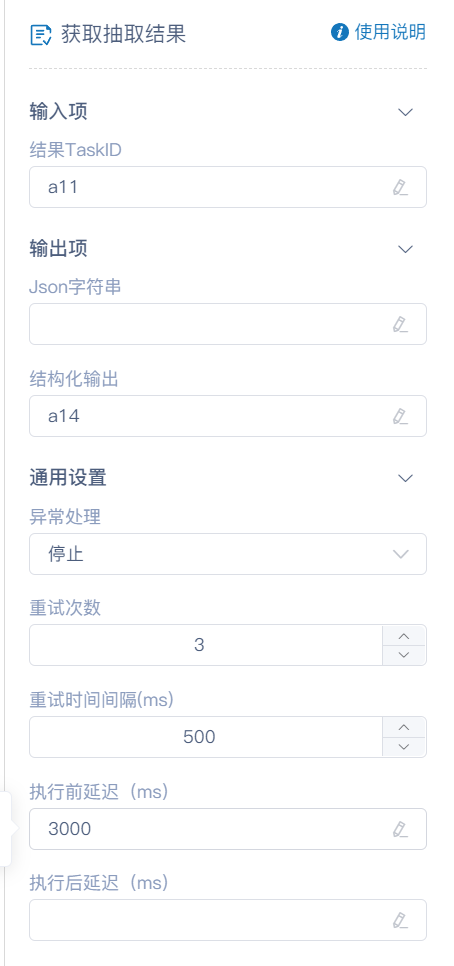 - 由于【while】活动会持续调用【获取抽取结果】活动,对【获取抽取结果】活动的额度消耗很快,建议【获取抽取结果】活动执行前加延迟以减少额度消耗