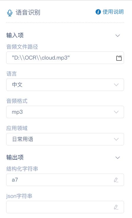 执行逻辑:将上传的音频经过系统处理后转换成文字输出到指定的变量中