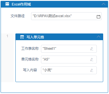 单独使用该活动并没有实际的意义,需要与其他活动配合使用,如"Excel作用域"+"写入单元格":