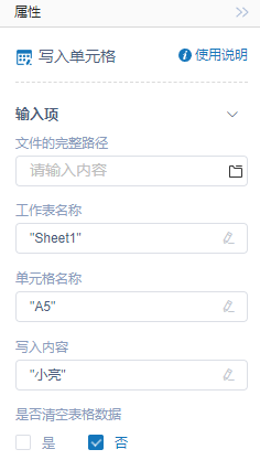 "写入单元格"活动不需要填写属性"文件的完整路径",将默认操作"Excel作用域"中读取的Excel文件,以下是"写入单元格"的活动属性: