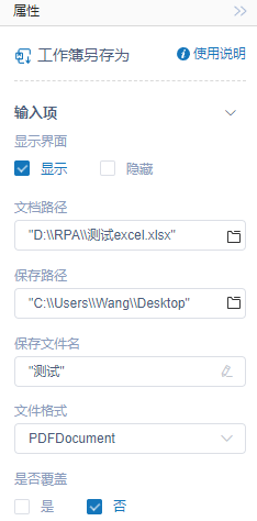 执行逻辑:RPA查找文档路径对应的Excel文件,通过读取保存路径的值,获取另存为后文件的保存路径,读取属性字段保存文件名的值,将其设置为另存为后的文件名称,读取文件格式的设置,对应生成相应的文件格式,在另存为时可选择是否覆盖,当显示界面为显示时,另存为时可以在界面中查看待操作的Excel文件。