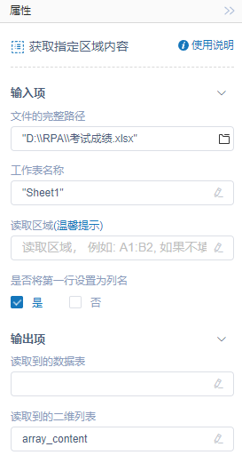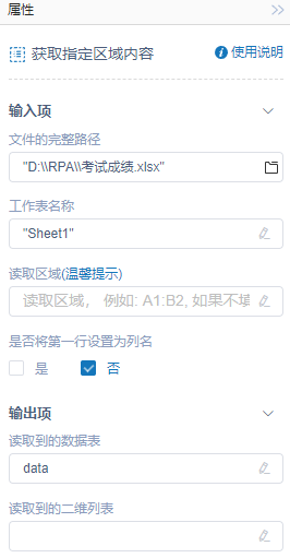 数据表类型的数据中有时候可能没有列,只有数据,因此设置了"列写入顺序"运行时会出现报错的问题,在该例中,在"获取指定区域内容"活动属性中需将"是否将第一行设置为列名"设置为"是",数据中才会有列信息,再次运行两个活动: