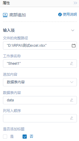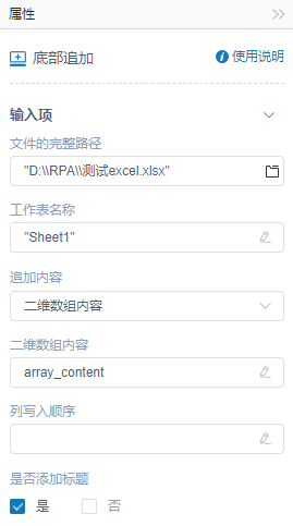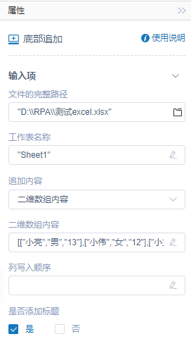 执行逻辑:RPA查找文件的完整路径对应的Excel文件,通过设置的工作表名称定位到需要写入内容的工作表,判断追加内容的数据格式是数据表内容还是二维数组内容,将数据写入,如果追加内容选择数据表内容时,可以设置列写入顺序,同时在写入时可以为数据添加标题,根据是否添加标题选项值"是"和"否"进行判定,标题的格式为:Column_1)Column_2...