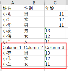例2:当数据表类型变量数据格式为[{\"Column_1\":\"小明\",\"Column_2\":\"12\",\" Column_3\":\"男\"},{\"Column_1\":\"小红\",\"Column_2\":\"21\",\"Column_3\":\"女\"},{\" Column_1\":\"小华\",\"Column_2\":\"11\",\"Column_3\":\"男\"}]时,可自定义列写入顺序为['Column_3','Column_1','Column_2']或['Column_2','Column_1','Column_3']