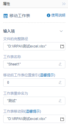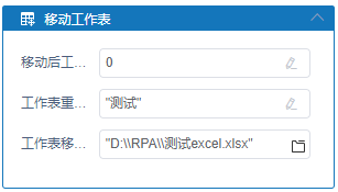 执行逻辑:RPA查找文件的完整路径对应的Excel文件,通过设置的工作表名称确定待移动的工作表,读取工作表移动到属性字段的值,获取需要将工作表移动至哪个Excel文件中,读取属性字段工作表重命名为的值,移动后时对工作表重命名,若不填,则不修改名称,读取属性字段移动后工作表位置索引的数字,判断移动之后工作表在Excel文件中的位置。