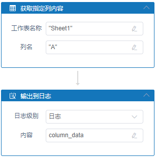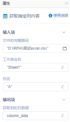 执行逻辑:RPA读取文件的完整路径对应的Excel文件,通过设置的工作表名称和列名,获取该列中的数据,并输出到获取到的列数据。