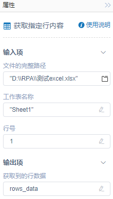 执行逻辑:RPA读取文件的完整路径对应的Excel文件,通过设置的工作表名称列名,获取该列中的数据,并输出到获取到的行数据