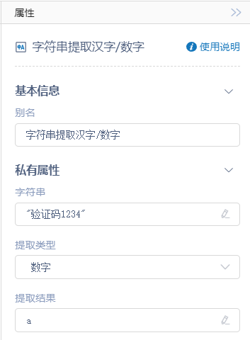将活动运行后提取出的结果数据输出至指定变量,提取结果为字符串数组,原字符串中相连的字符将会拼成一个字符串,不相连的字符将会是数组中的两个元素。注意,如果需要提取"汉字+数字",则相连的汉字和数字也会分为两个元素