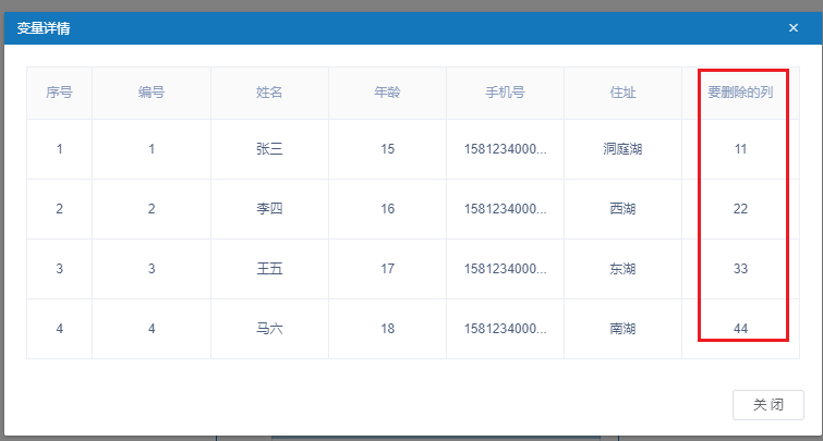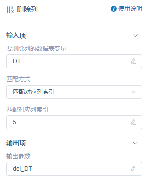 返回删除列后的数据表变量,为输出参数