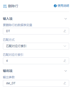 选择删除行的匹配方式,支持下拉选项匹配对应的数据行、匹配对应行索引,然后在下方输入框填写匹配对应的数据行、匹配对应行索引具体数据
