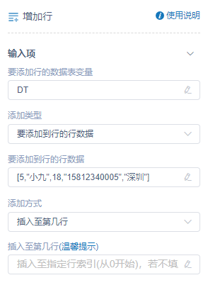 选择行数据的添加方式,支持单选插入至第几行、插入到行名方式,然后在下方输入框增加插入至第几行(*[整型])、插入到行名([字符串]*)的具体数据