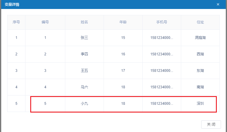 2)将行数据[5,\"小九\",18,\"15812340005\",\"深圳\"]添加至最后一行