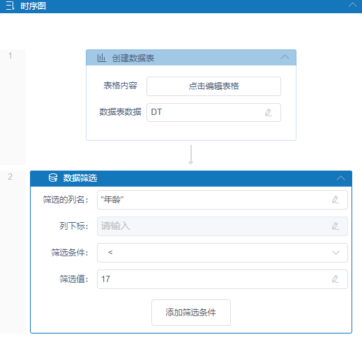 执行逻辑:输入筛选的列名或列下标,根据筛选值和筛选条件对数据表变量进行筛选,并返回数据到结果数据表中