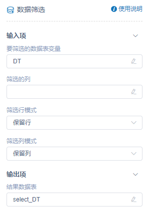 按给定条件对数据表进行筛选,并将结果输出到变量。"筛选列信息"可以输入列索引或列名