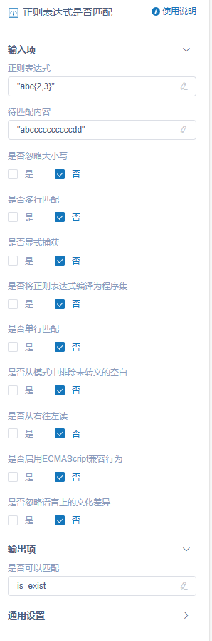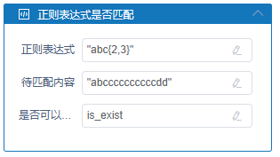 用于在执行流程的过程中,判断给定的正则表达式是否可以匹配输入的字符串,并返回布尔类型的匹配结果,true代表匹配,false代表无法匹配
