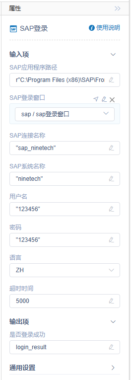 执行逻辑:RPA根据用户配置的SAP应用程序路径以及sap登录窗口元素,并配置SAP连接名称、SAP系统名称、用户名、密码、语言,RPA运行时候,会启动SAP软件并进行登录,并返回是否登录成功到输出变量是否登录成功;