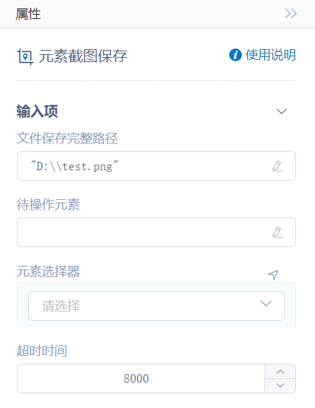 执行逻辑:RPA通过输入项中待操作元素或者元素选择器选择的元素,选中该*元素并截图保存至输入项中的*文件保存完整路径