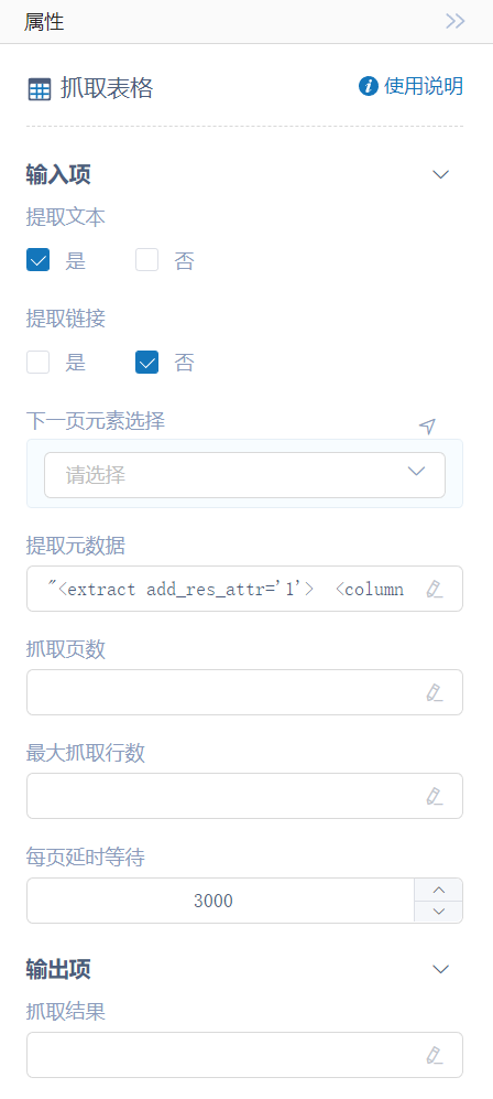 执行逻辑:RPA 通过输入项中提取元数据选择的元素,抓取该元素对应的表格数据,若输入项中下一页元素选择有值则点击下一页并抓取,若输入项中抓取页数有值则抓取指定页数后停止,否则一直抓到最后一页,将抓取结果输出至输出项的抓取结果变量。抓取会在下一页按钮消失、不可点击,或者达到最大抓取页数后停止。