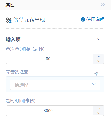 执行逻辑:RPA通过输入项中待操作元素或者元素选择器选择的元素,判断该元素是否出现,若出现则结束,否则进行等待,直至超时