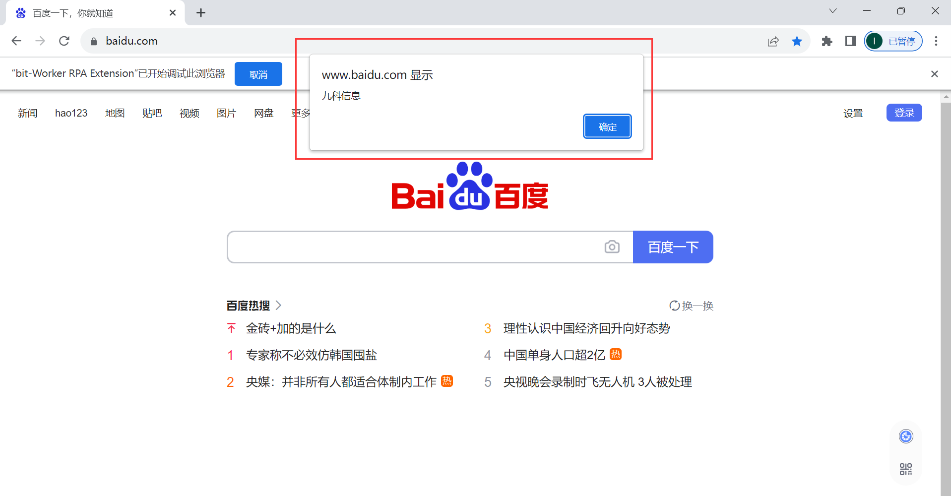 7)根据js代码,在"百度"网页中弹窗提示"九科信息",并返回值"九科信息"