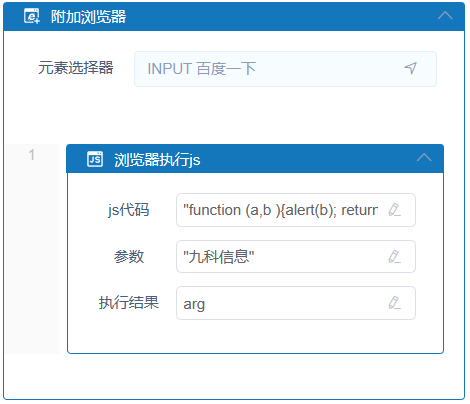 执行逻辑:RPA通过浏览器变量中的元素对象定位到目标网页,在该网页中根据js代码和参数执行JavaScript脚本