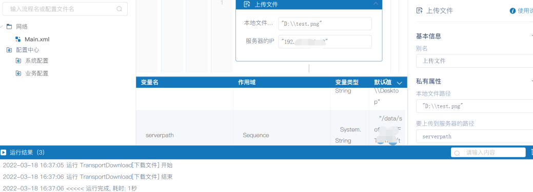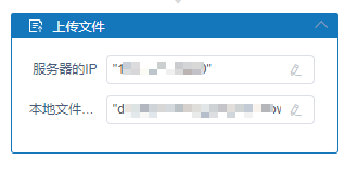 1、在"上传文件"活动输入项属性中输入服务器IP、用户名、密码、本地文件路径、要上传到服务器的路径