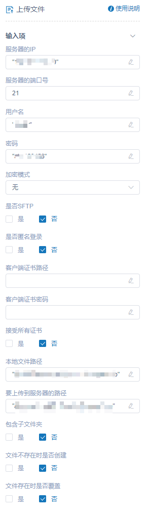其他说明:端口默认21,需确保21端口可用;客户端证书路径"与"客户端证书密码"根据实际需求填写,不做必要要求。单独使用该活动时需要输入IP、用户名、密码信息,如果放入"FTP链接"活动中,则可以不用输入相关信息。