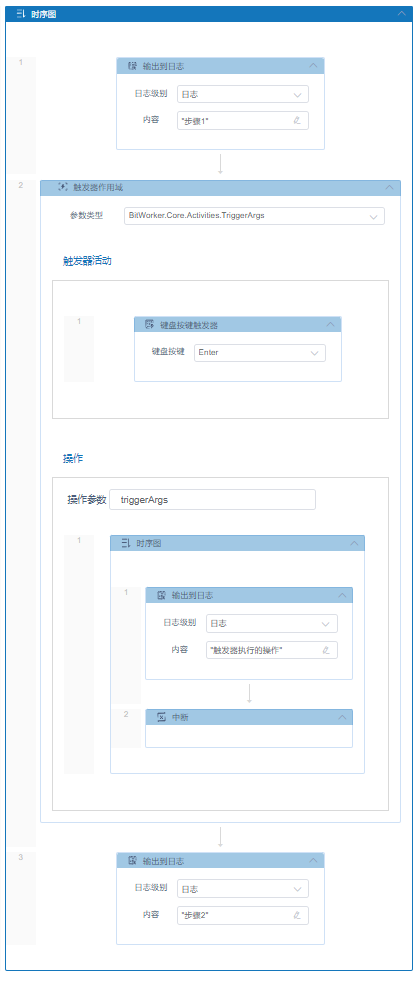 若想跳出触发器作用域,需要搭配【中断】活动。【操作】区域中的活动需要放置在时序图内