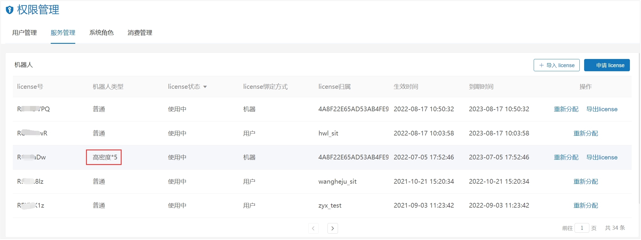 2)选择一个机器人类型高密度的license,点击license右侧的 「操作」 按钮,将其分配给指定的机器或用户;