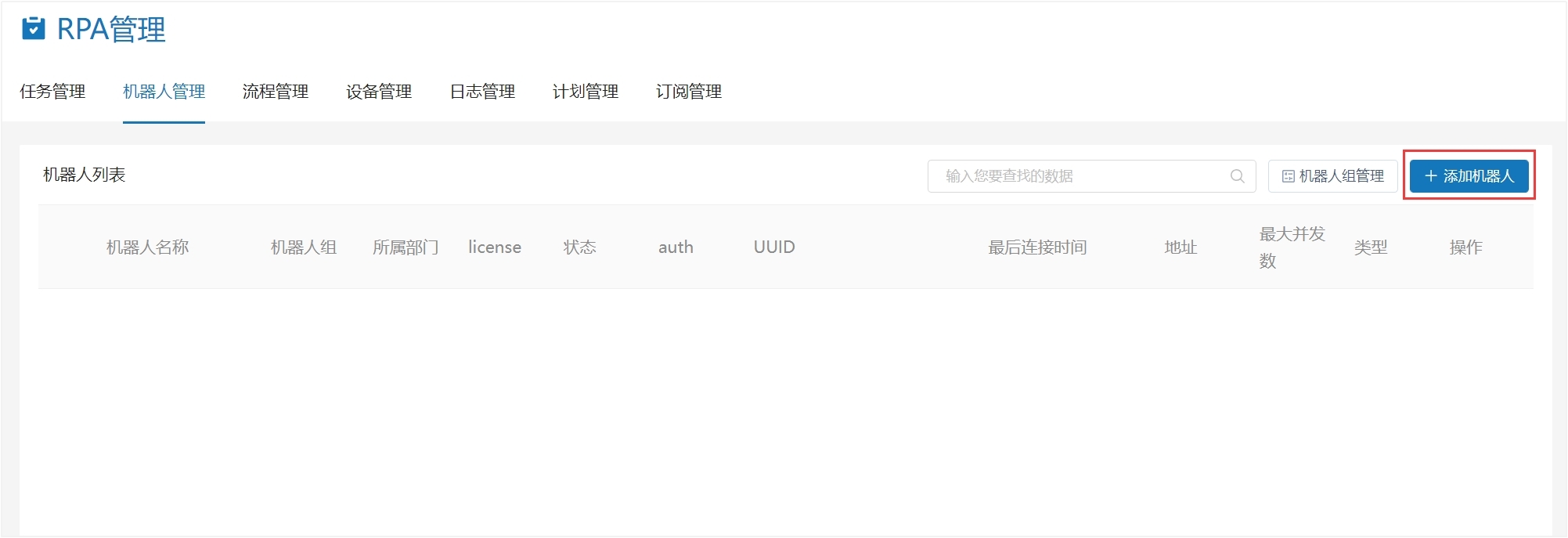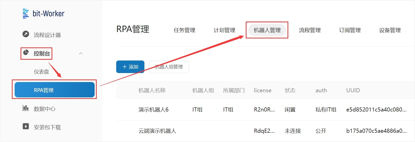 3)license分配完成后,进入 控制台--RPA管理--机器人管理 模块;