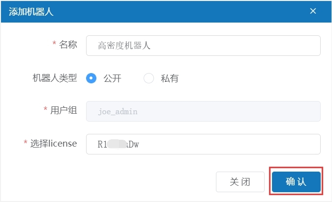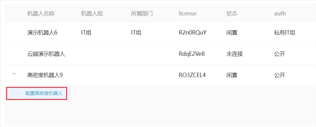 4)点击机器人列表右上角的 「添加机器人」 按钮,在添加窗口中,选择已分配高密度机器人的license;