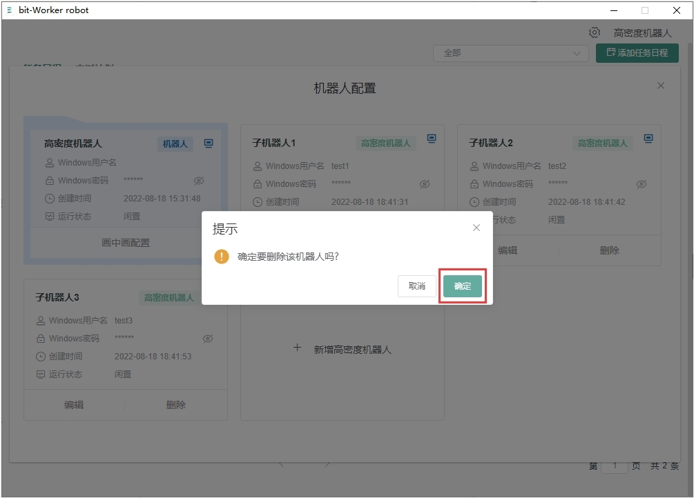 2)点击 「确定」 按钮,即可删除已配置的子机器人,不支持删除主机器人;