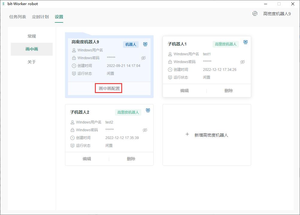 1)点击第一个高密度机器人卡片下的 「画中画配置」 字样,即可配置主机器人信息;