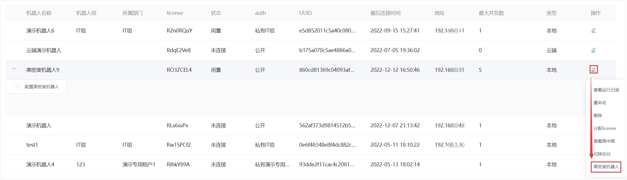 • 控制台端入口:进入控制台--RPA管理--机器人管理模块;用户可以在高密度机器人列表中点击 「配置高密度机器人」 字样,或点击机器人最右侧的 「操作」 图标,选择 「高密度机器人」 ,来配置高密度机器人信息。