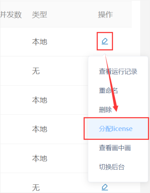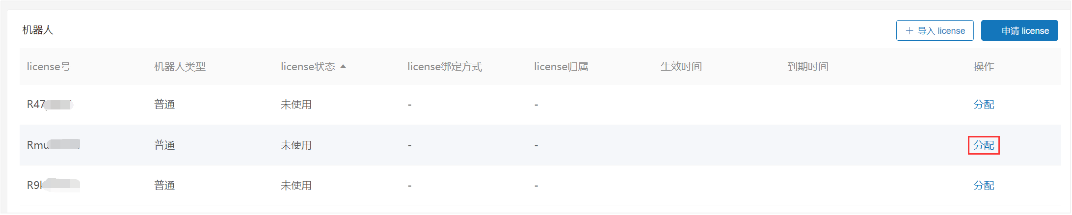 4)点击机器人最右侧的 「操作」 按钮,选择 「分配license」 ,即可将已绑定机器或用户的license分配给指定机器人。