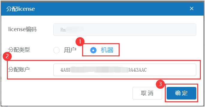 2)点击license右侧操作栏下的 「分配」 字样,会弹出license窗口分配,用户可在此选择将license分配给机器或者用户;