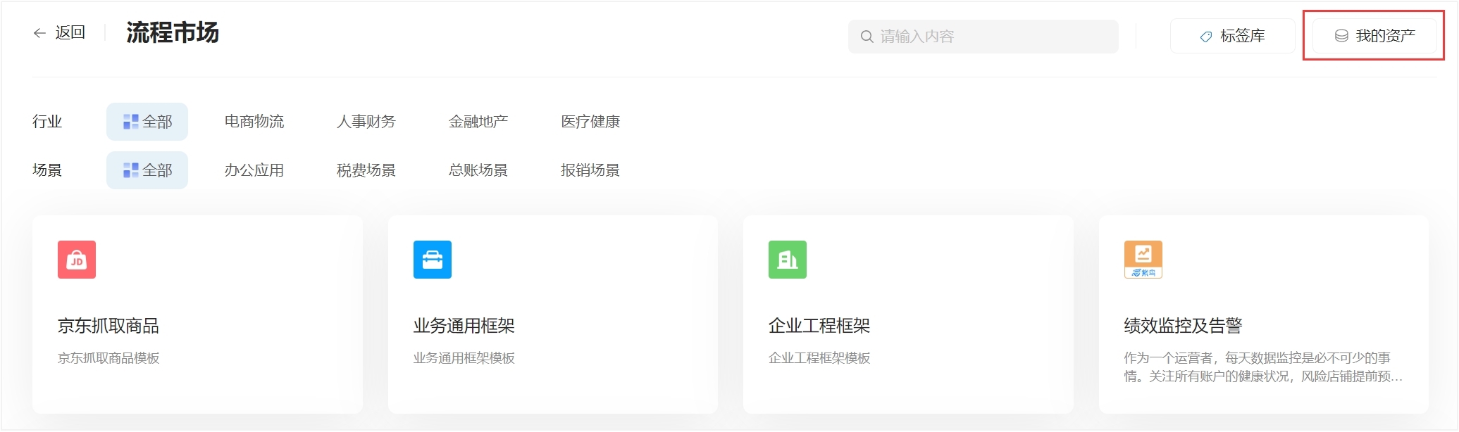 点击流程市场右上角 「我的资产」 按钮,可以查看当前账号下发布的自定义模板,以及自定义组件。