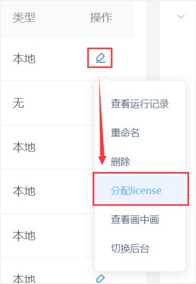若机器人在添加时未分配license,或者当前机器人需要更换license,可点击 「操作」 图标,选择分配license,为机器人重新分配license。