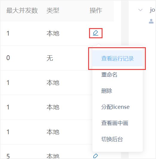 1)选择要连接使用的机器人,点击 「操作」 图标,选择 「分配license」 ,即可唤起分配窗口;