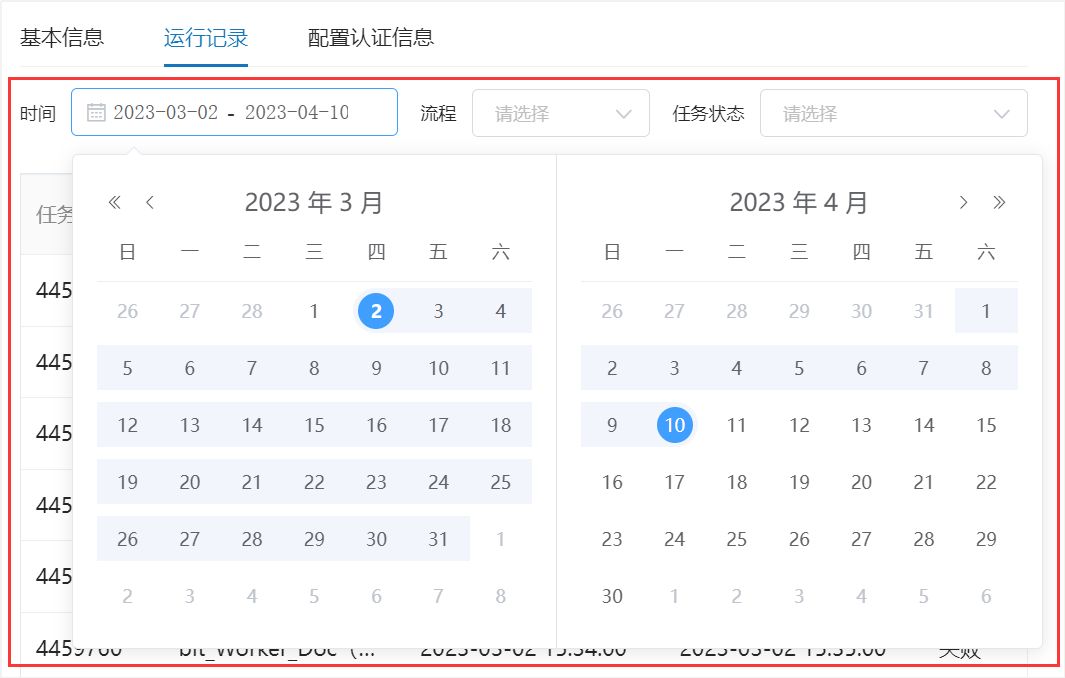 - 运行记录中展示项为:任务ID、流程、启动时间、结束时间、状态。