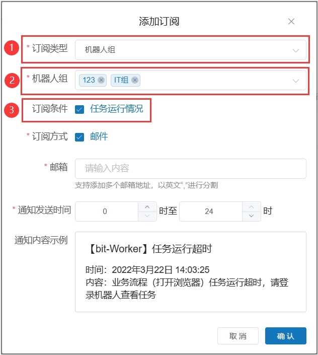 2)选择订阅类型及其订阅条件,支持选择任务运行、机器人、机器人组、资产、资源使用、机器人离线六种订阅类型,每种订阅类型下都支持多种订阅条件;
