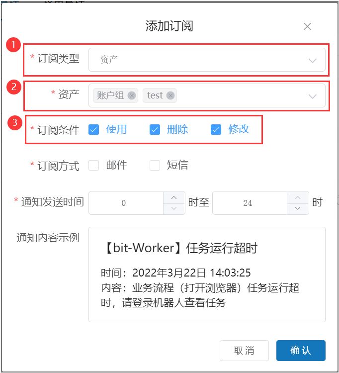 2)设置订阅方式,支持邮件和短信两种通知方式,可以添加多个邮箱地址和手机号码,以英文“,”符号进行分割;