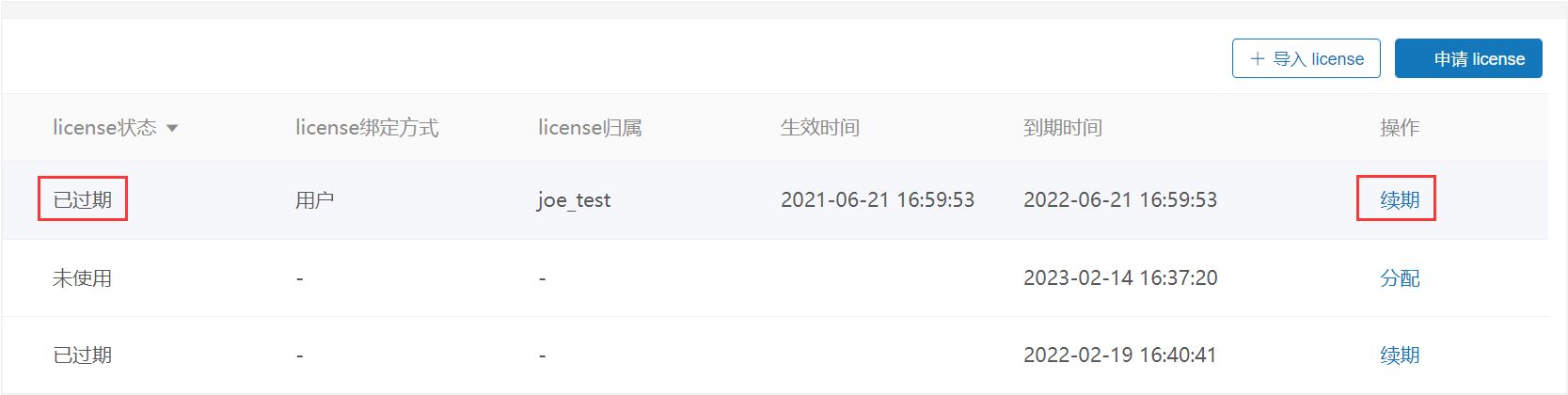同时,控制台license无需进行分配或导出操作,过期后可以在其操作栏下选择续期,来发起续期申请,申请审核通过后即可成功续期。