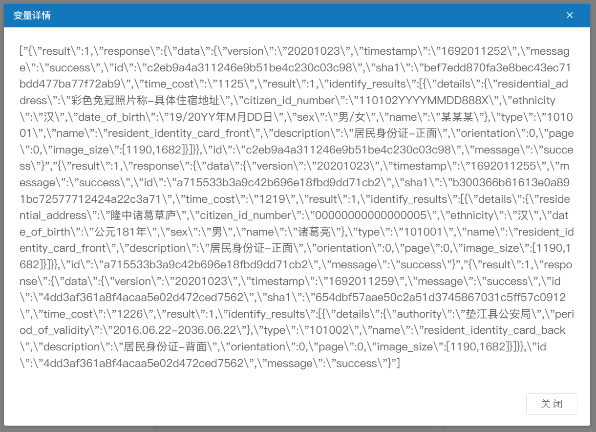 执行逻辑:RPA根据卡证类别和提供的图片路径,识别出不同的图片信息,再将指定页面识别范围中的内容输出至json字符串或结构化字符串变量中