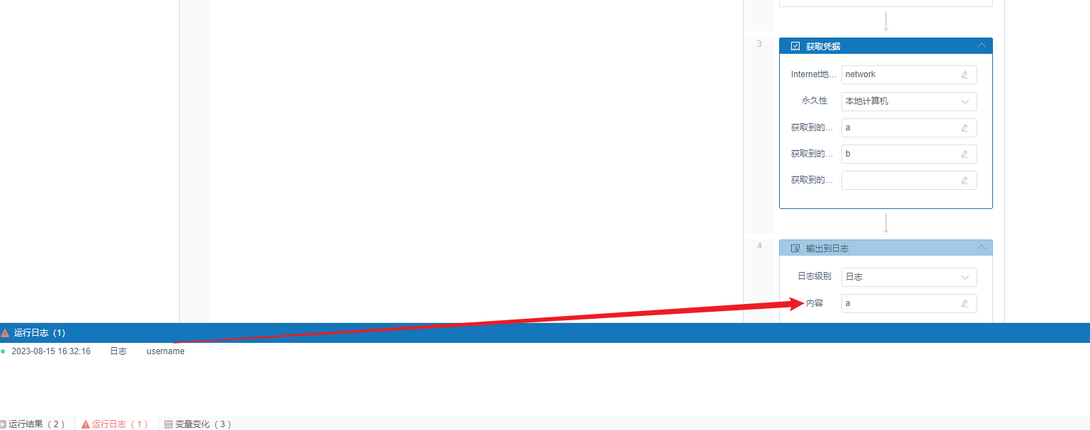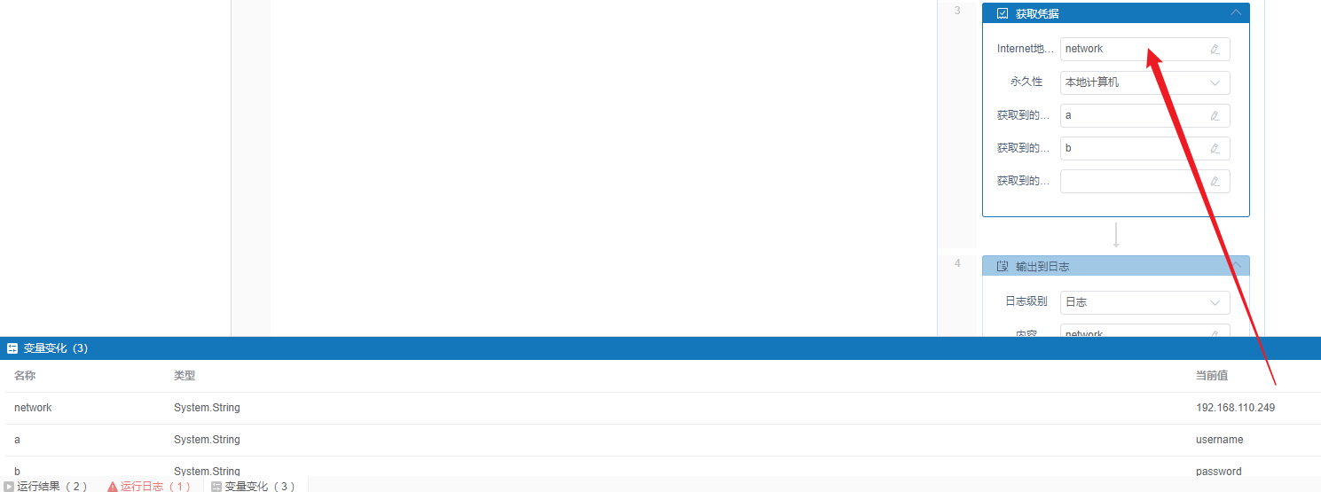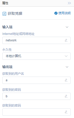 执行逻辑:程序会根据输入的Internet地址或网络地址获取指定地址的 Windows 凭据,可通过传递变量输出获取到的用户名和密码