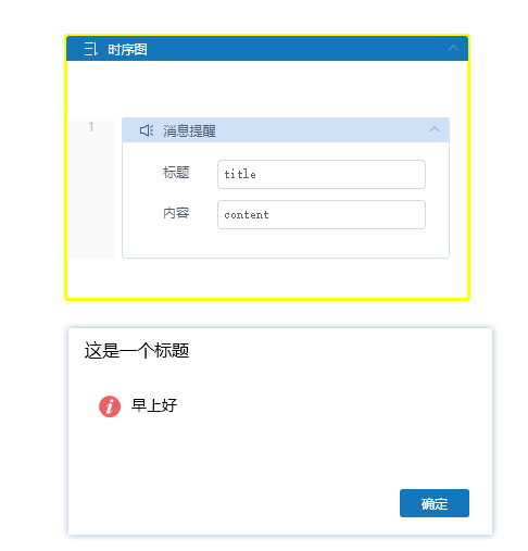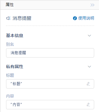 弹出消息提醒弹窗,可指定相应标题和内容,此活动只用于消息提醒,且提醒之后需要用户手动关闭,不要在需要自动执行的流程中使用