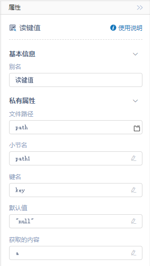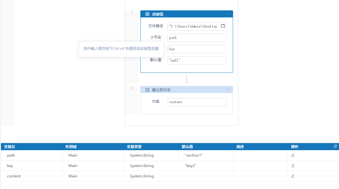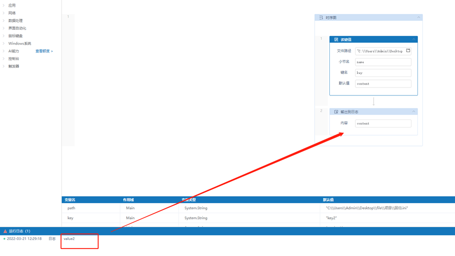 执行逻辑:输入指定的".ini"文件的绝对路径,并输入该".ini"文件的小节名、键名和默认值,将获取的内容(键值)赋值输出给变量(没有则返回默认值)
