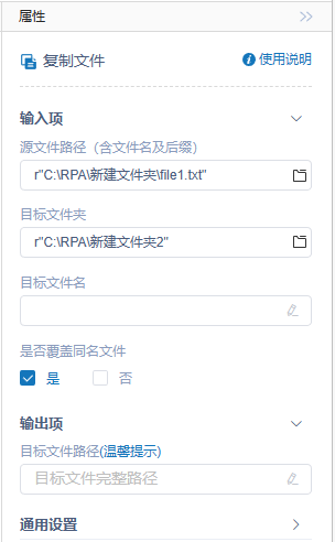 可选项,将文件保存后的文件路径输出为变量,设置变量后,该变量的值为复制文件的路径;